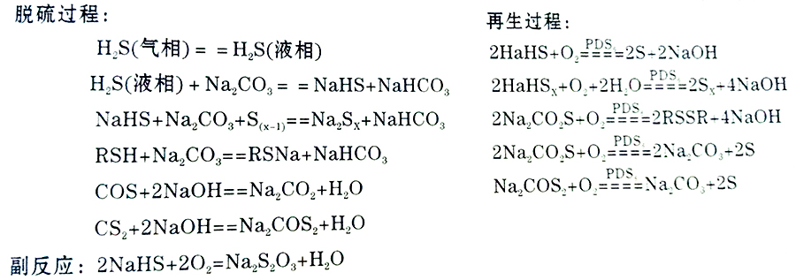 PDS高效脫硫催化劑主要活性組份為聚合磺化酞菁鈷.它是以其中心金屬離子價態(tài)改變和分子的大丌電子共軛為特征的氧化還原催化劑。在PDS2高效脫硫催化劑參與的脫硫過程中化學(xué)反應(yīng)為: